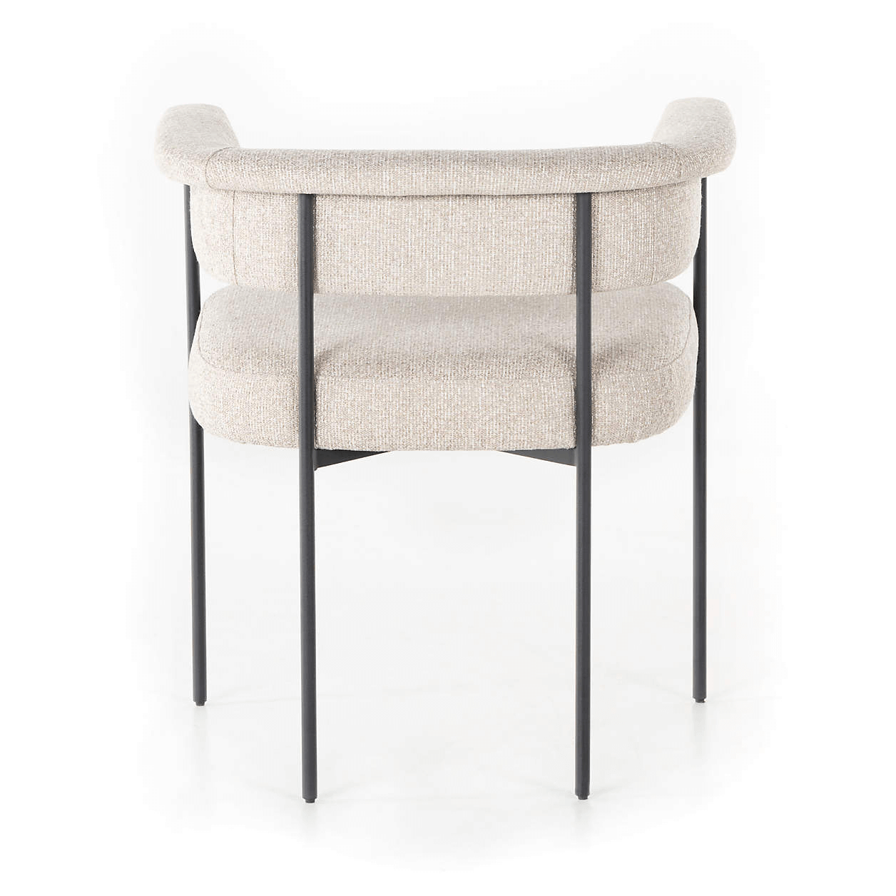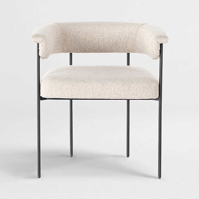 Our Sutter dining chair pulls up to the table looking light and contemporary. Slim, black-finished iron crafts the airy frame, securing a cushioned seat and sculpted yoke back with fold-over detailing. The beige polyester upholstery complements with a textured bouclé weave. We love our Sutter dining chair paired with our marble or architecture-inspired dining tables.