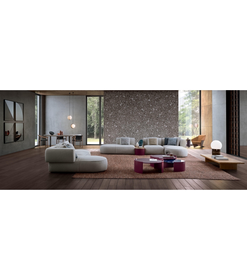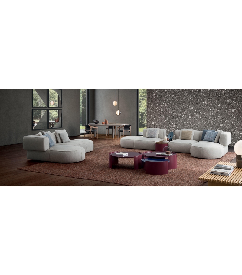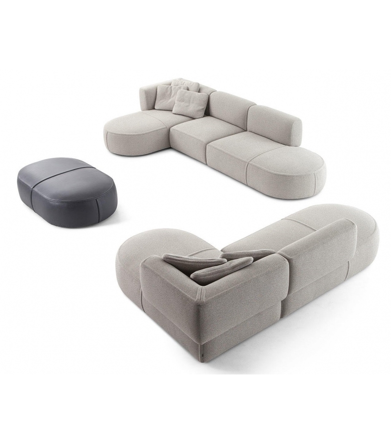 An inventive sectional sofa, with soft, inviting curves that bespeak comfort to the max and extreme versatility. The rounded arm-rests curve to meet the back, the shape expressing the crafts excellence, more evidence of which can be seen in the upholstery edge-stitching that delineates the lines of the various elements. The sofa is composed of single units that have been conceived as if they were individual sculptures, so they work equally well as part of a team or as stand-alones.Â