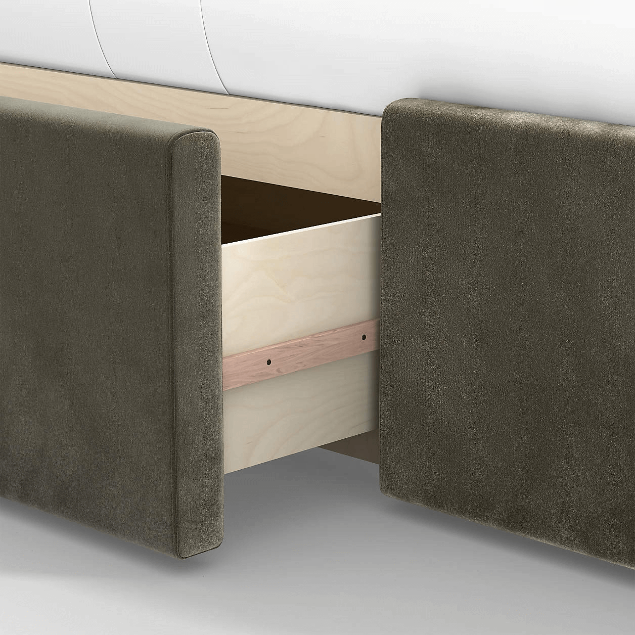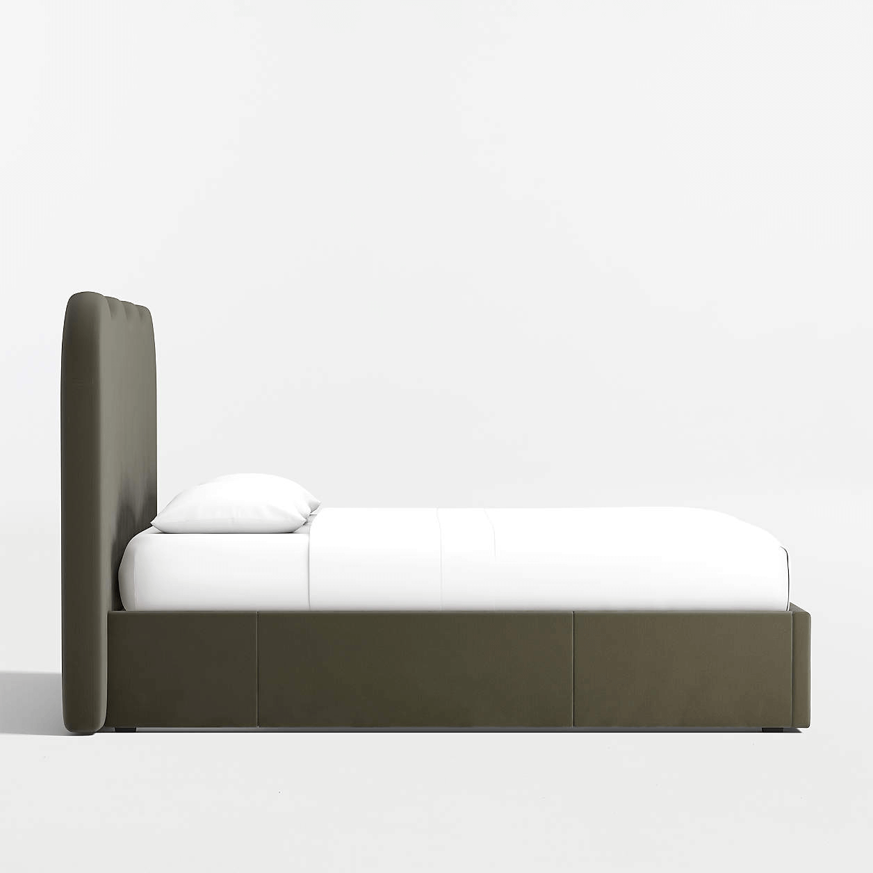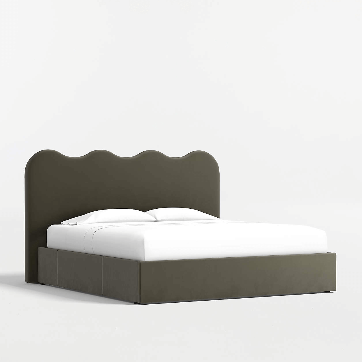 The Elara Upholstered Storage Bed with a curved headboard offers a perfect blend of sophistication and practicality. Designed to maximize space, this bed features hidden storage for a clean, organized bedroom