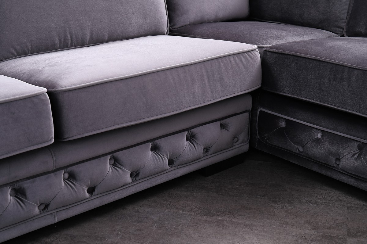 The Low Button Upholstered Box Sofa adds a touch of sophistication, creating the most striking outline. A statement of superb quality, offering the ultimate in supreme comfort and style. The glamour and timeless design of this beautiful sectional would suit both a classic or contemporary interior. A solid wooden structure, padded in various densities. All perfectly supported on contrasting contemporary nickel low level plinth feet.