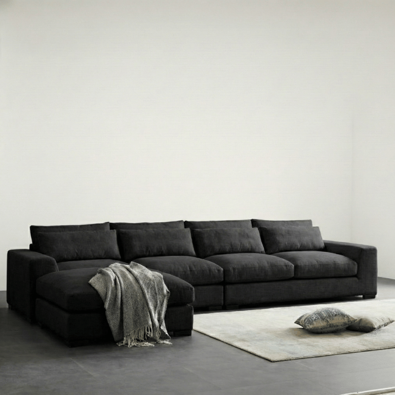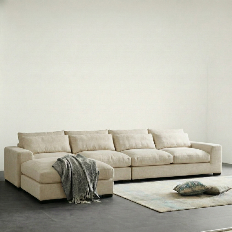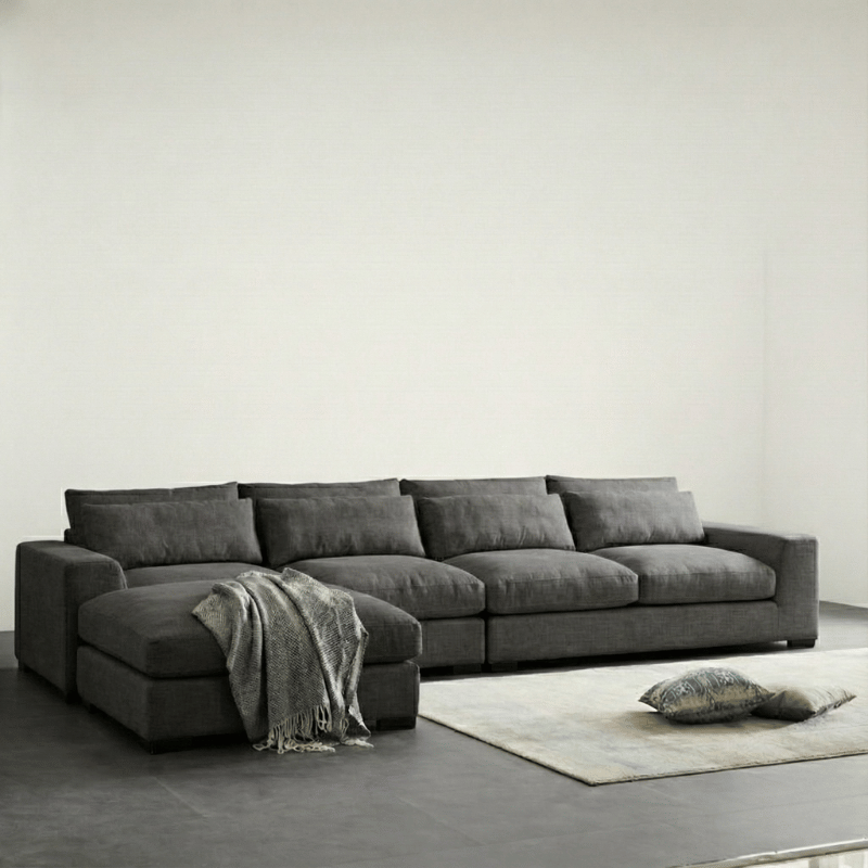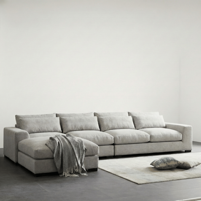 Nothing says class, sophistication, and smooth comfort quite like this luxury sectional sofa, which includes 2 pieces of the couch, and ottoman, comfortable pillows and a Harper Linen Reversible Corner Sectional with Ottoman. It combines thick cushioning with linen fabric, square arms, and a vintage look that takes you back to the bold and luxurious days of the 1950s. With a light grey color to match your décor, this sofa can fit perfectly with a contemporary look, classic style, or more rustic-looking living space. What’s more, with a reversible back so you can sit up to watch your favorite movie. The seat and back cushions are removable, making it easy to clean the upholstery.