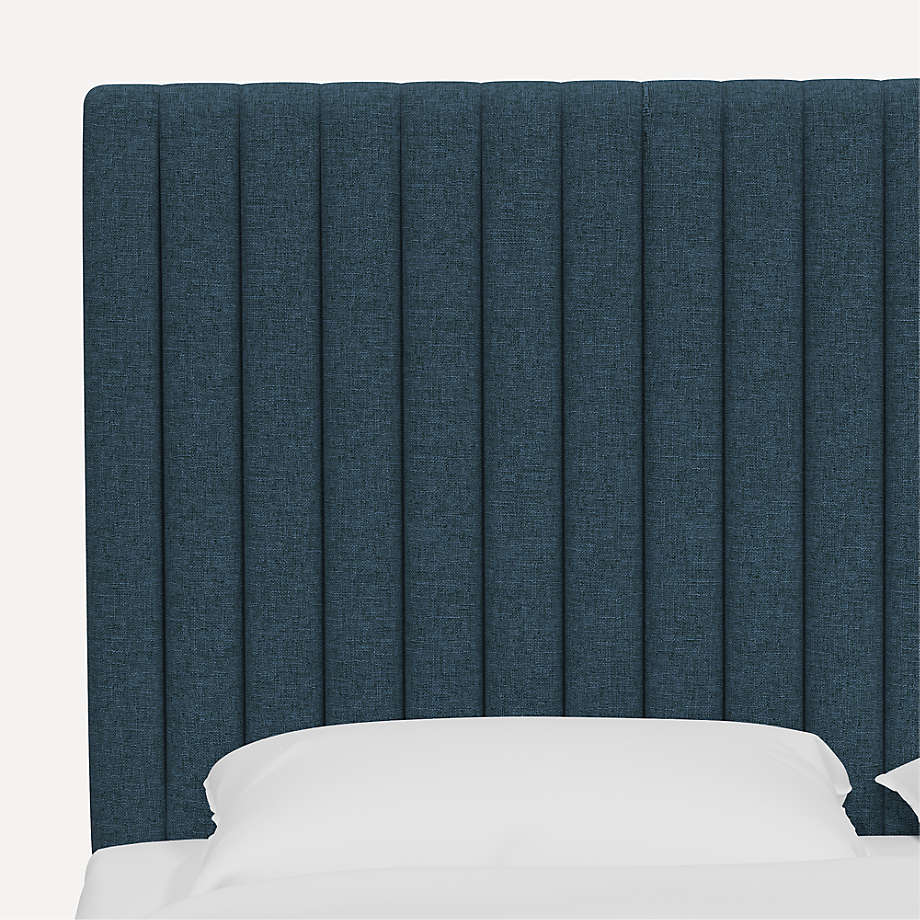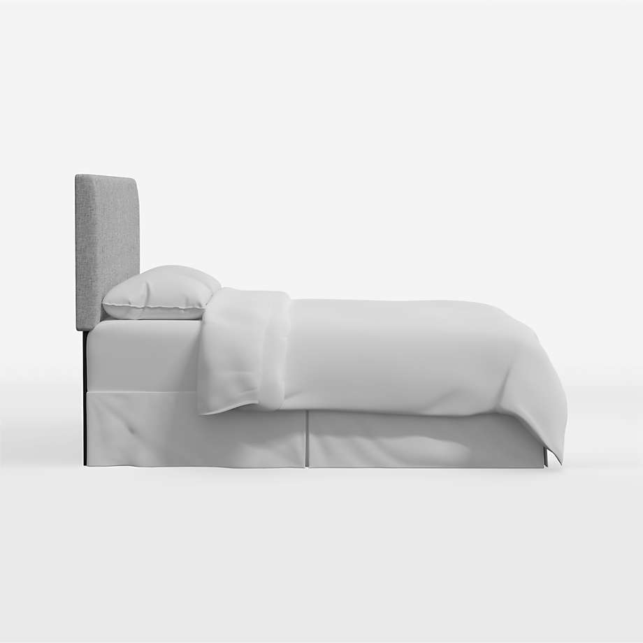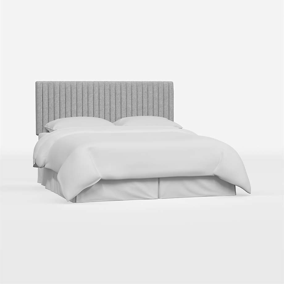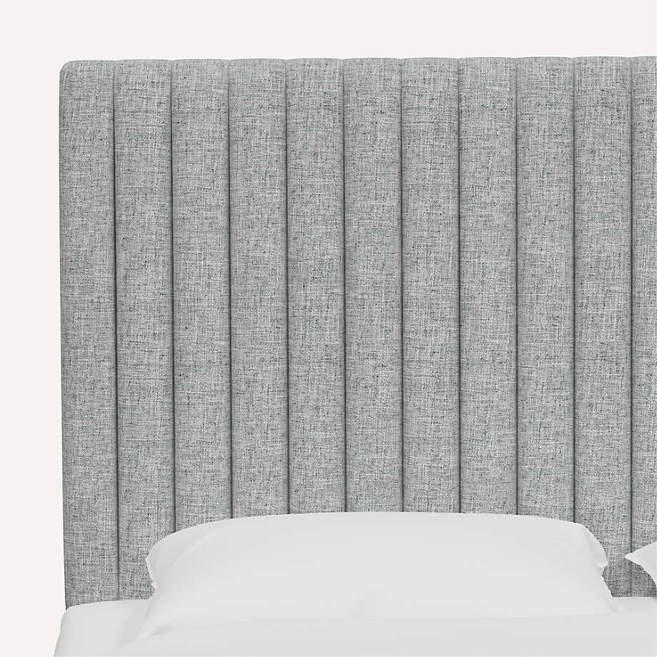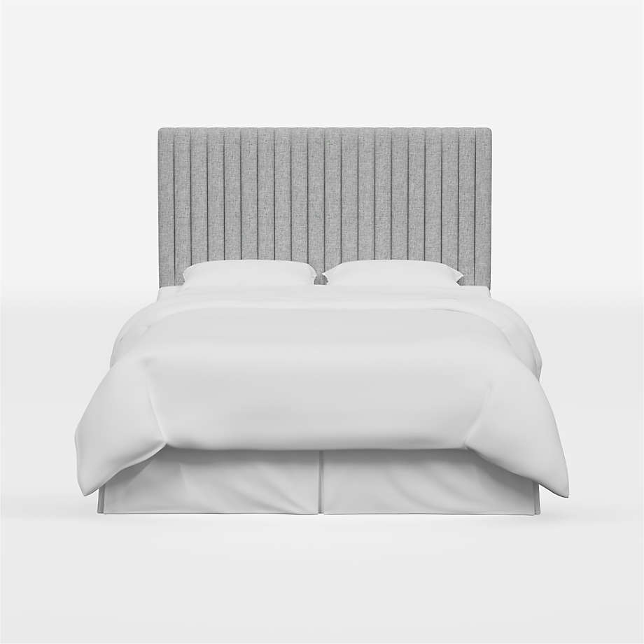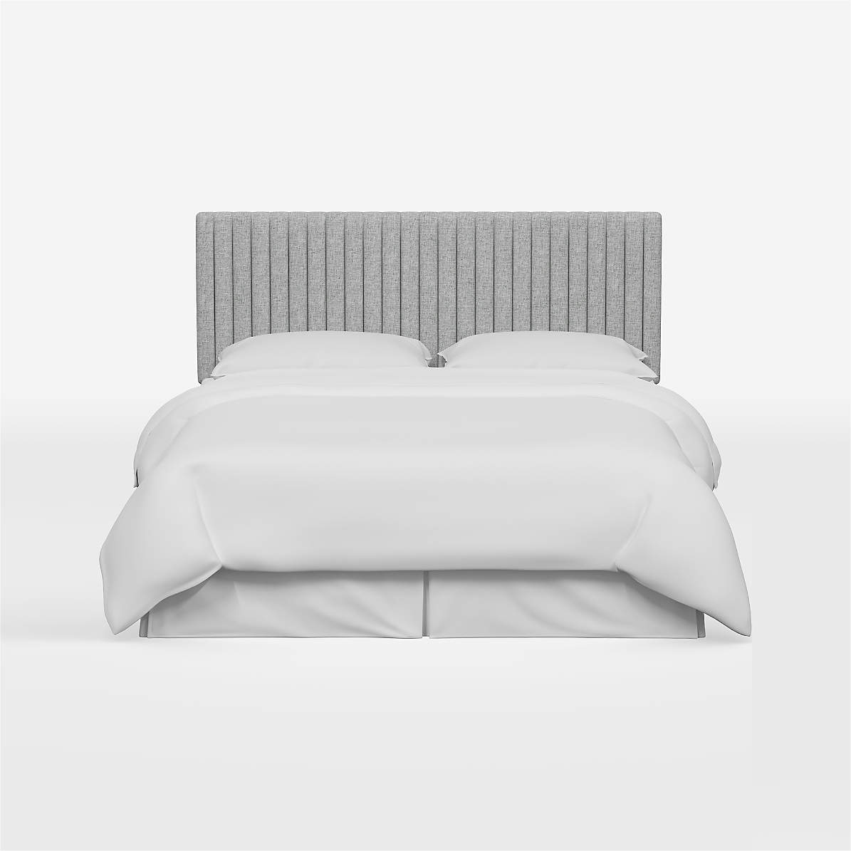 This headboard graces the bedroom with clean lines and a fully upholstered frame. Each made-to-order bed is upholstered by hand in a pale grey, linen-blend fabric with vertical channel tufting on the headboard. Attaching easily to any standard bed frame, the pumice-hued headboard instantly elevates the bedroom.