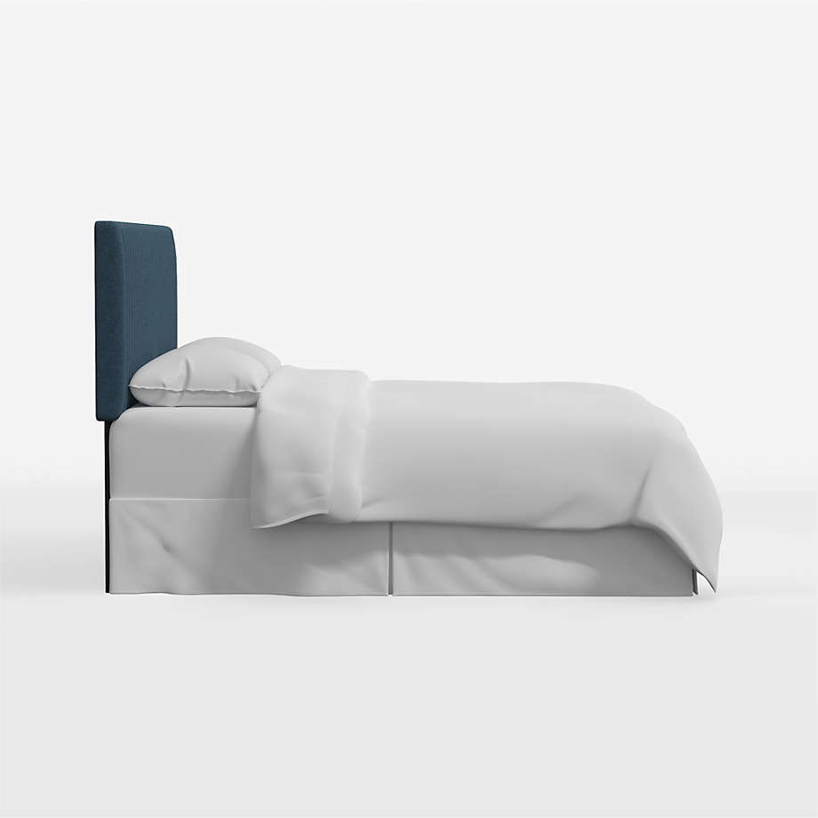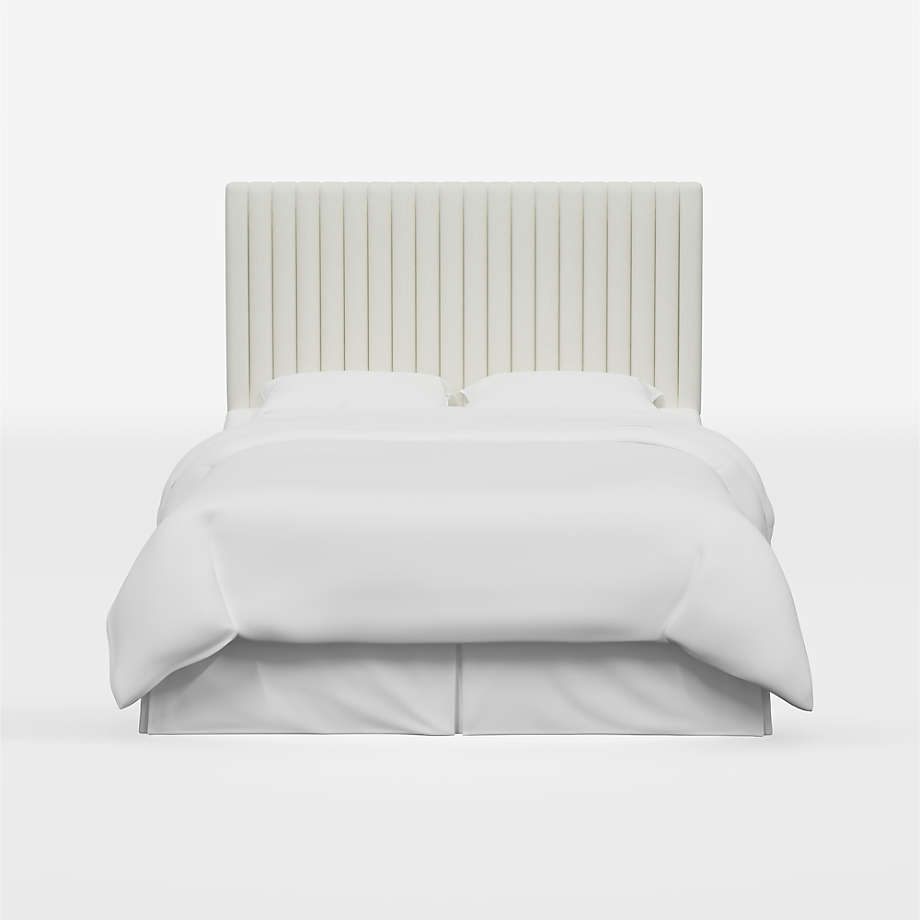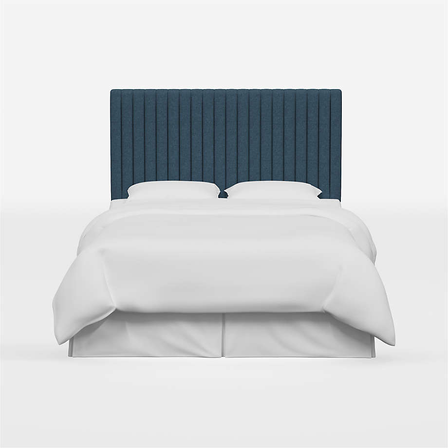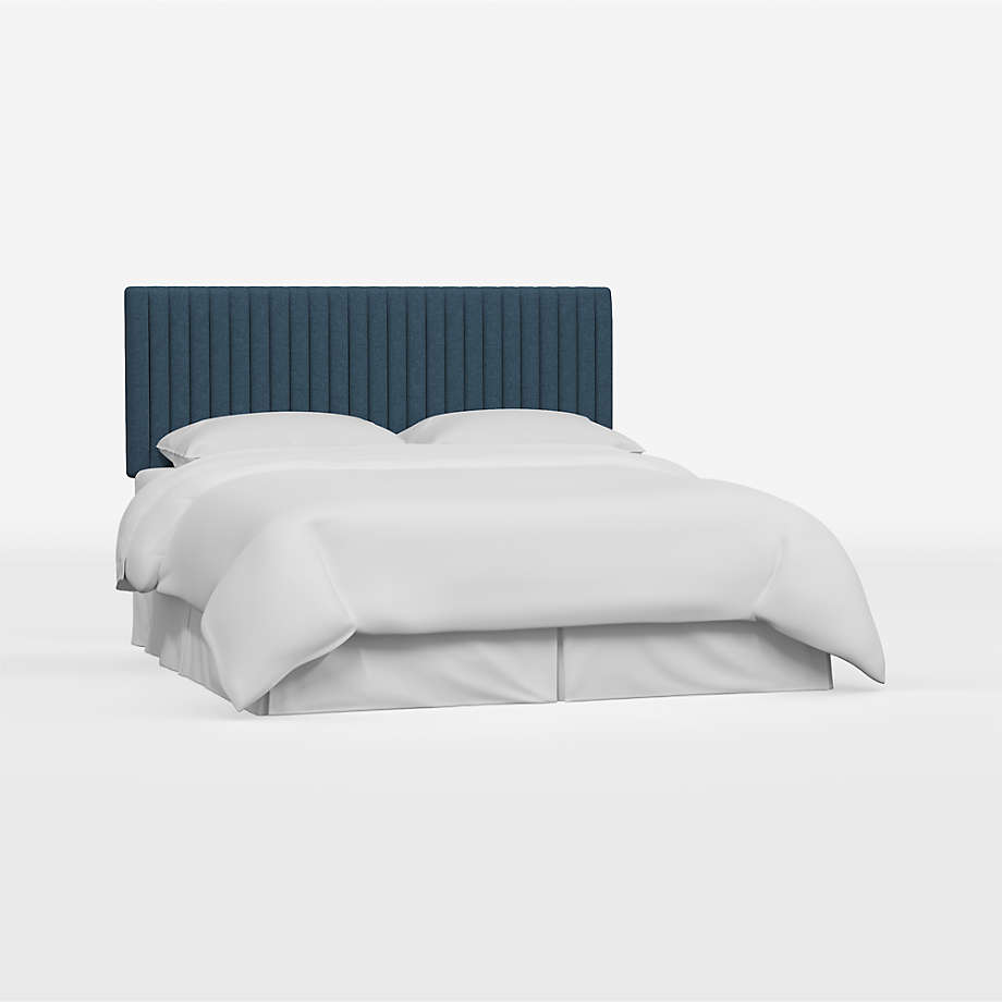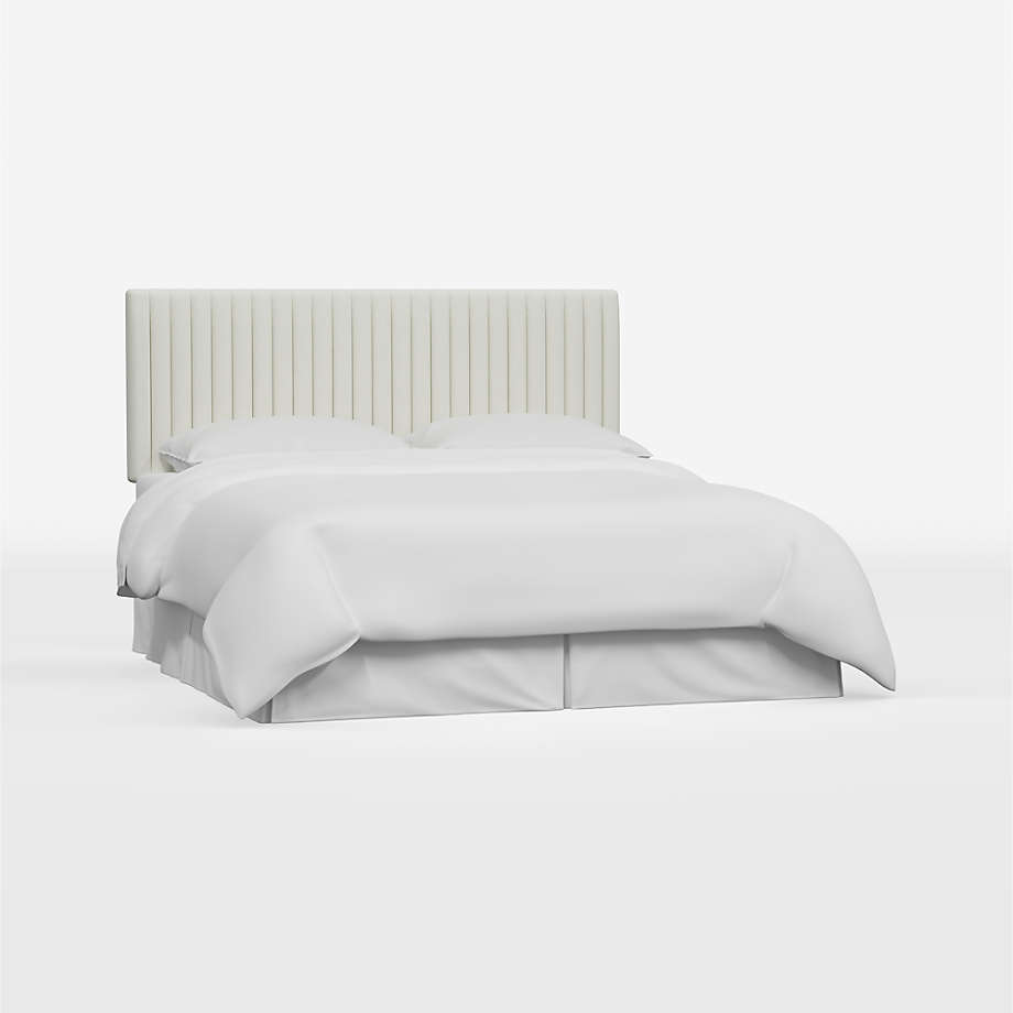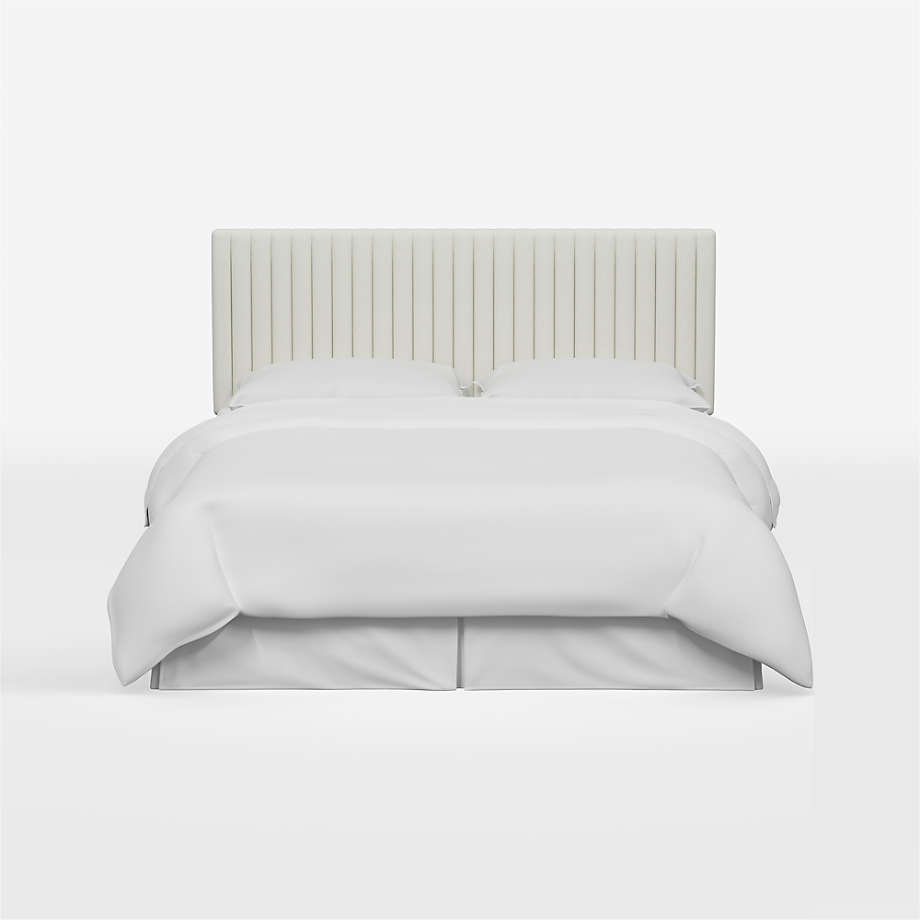 This headboard graces the bedroom with clean lines and a fully upholstered frame. Each made-to-order bed is upholstered by hand in a pale grey, linen-blend fabric with vertical channel tufting on the headboard. Attaching easily to any standard bed frame, the pumice-hued headboard instantly elevates the bedroom.