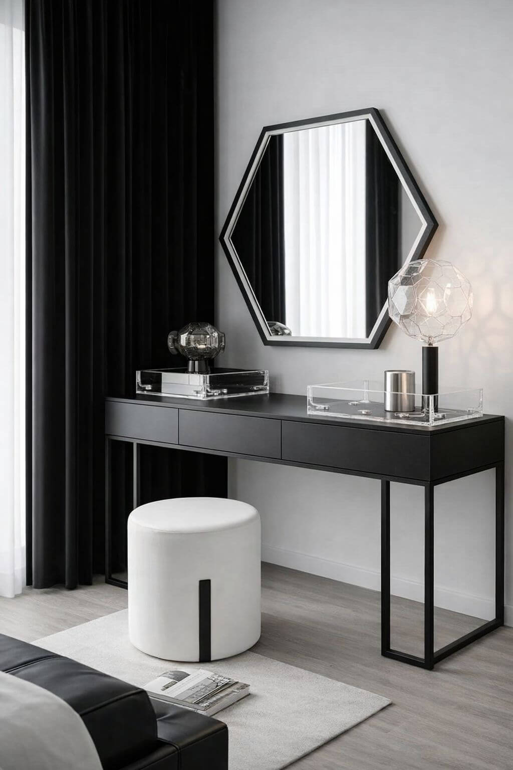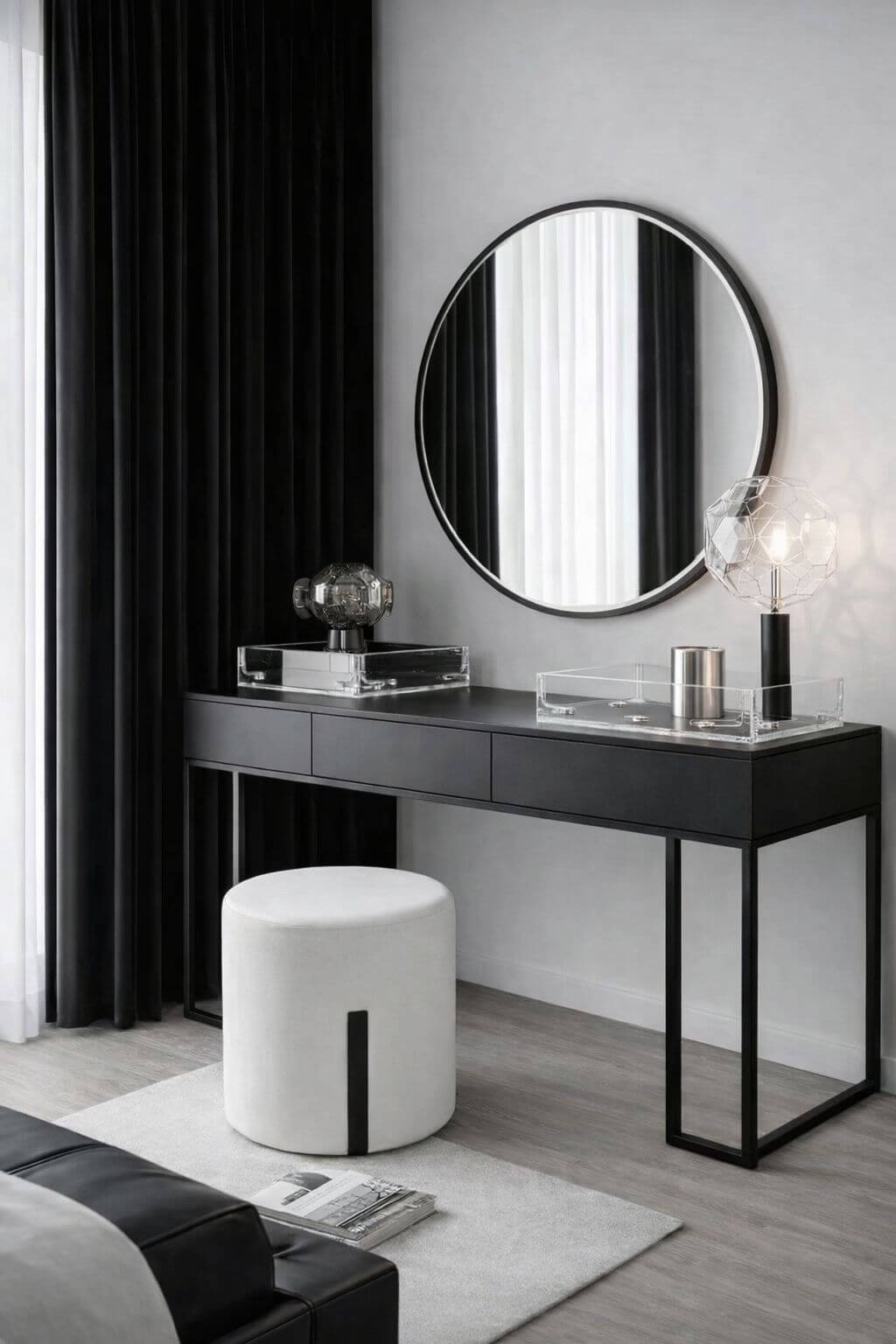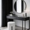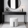This steel-framed dressing table is paired with a soft bouclé stool and a 600 mm round mirror. Clean lines timeless style and effortless elegance come together to create a sophisticated everyday luxury.