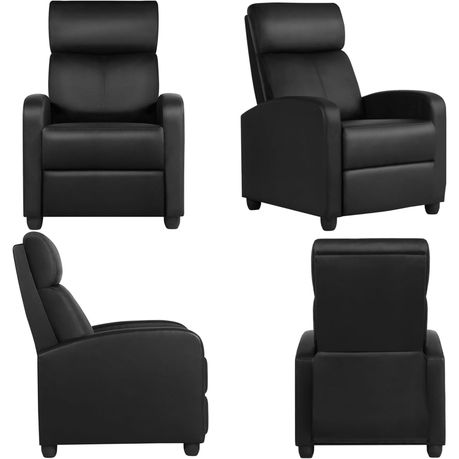 A soft PU & PVC leather single recliner chair with manual push adjustable reclining, footrest, and three-position relaxation for ultimate comfort.