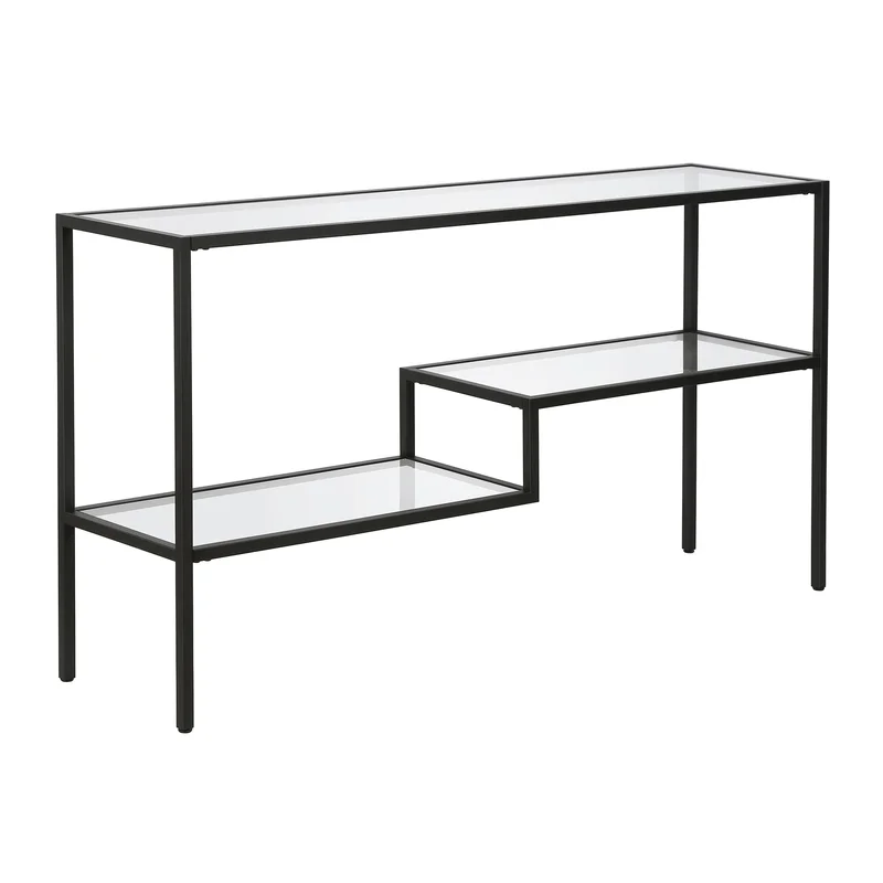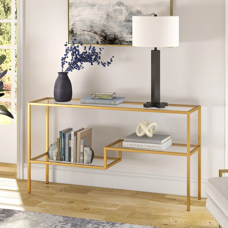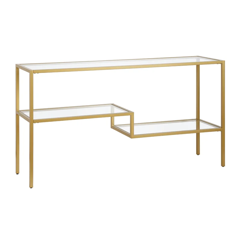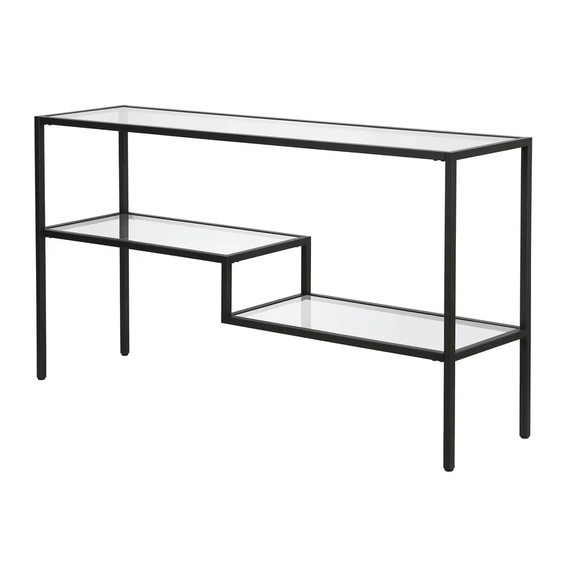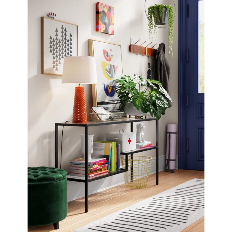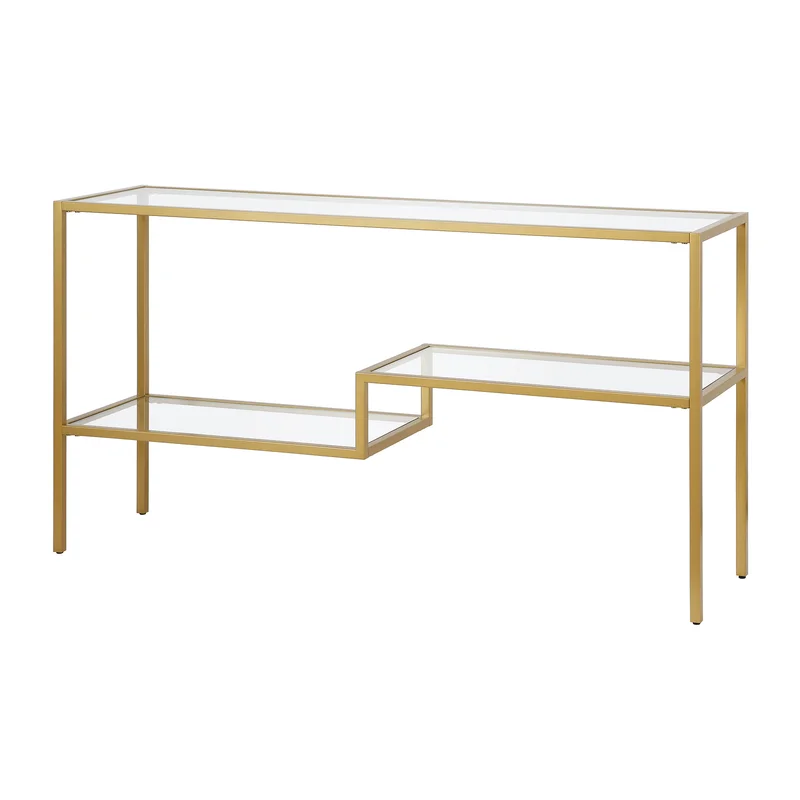 Bring a streamlined design to your living room or entryway with this modern console table. Crafted of steel in a metallic finish, this console table features a tempered glass tabletop that provides a perfect platform for framed photos or a pair of stylish lamps. A two-tiered glass shelf adds visual interest and creates extra storage space wherever you need it most.