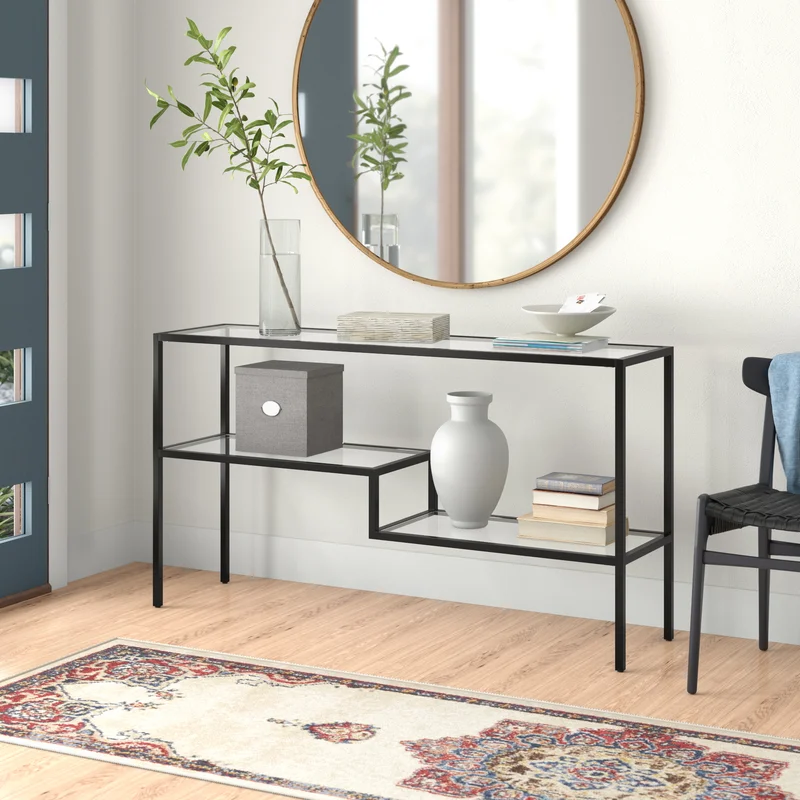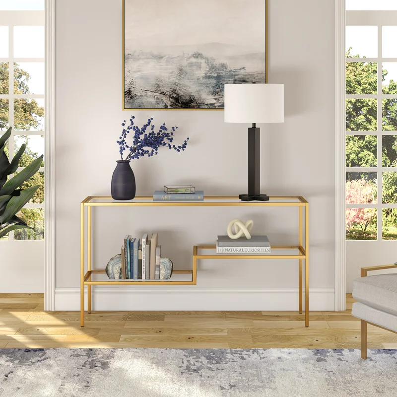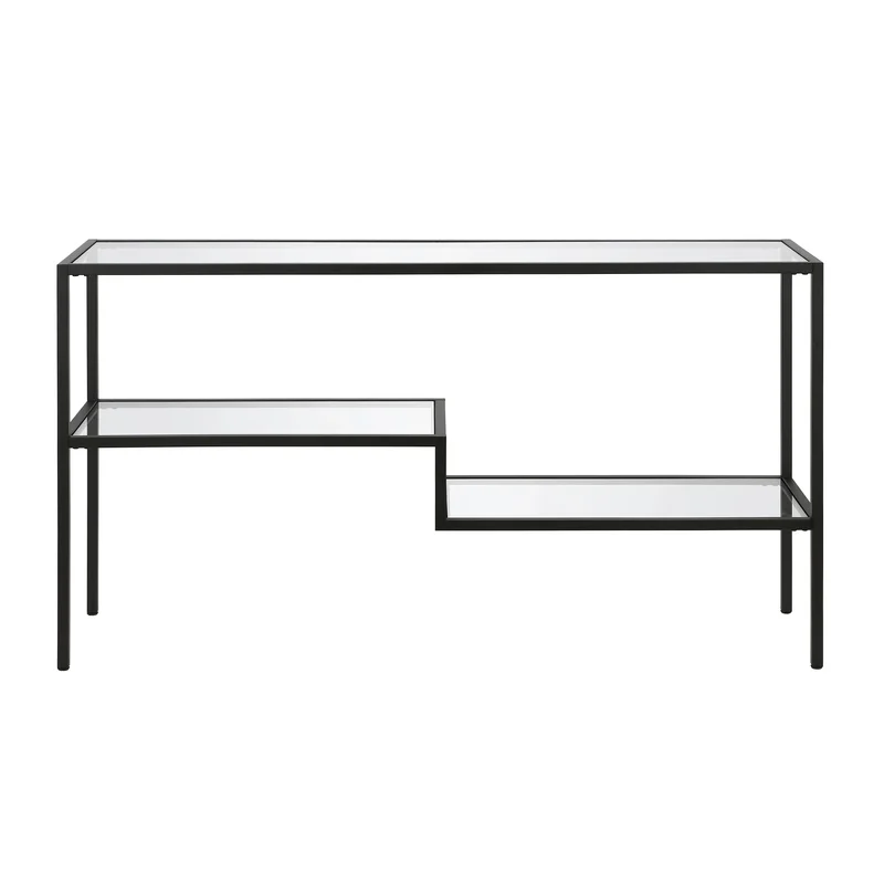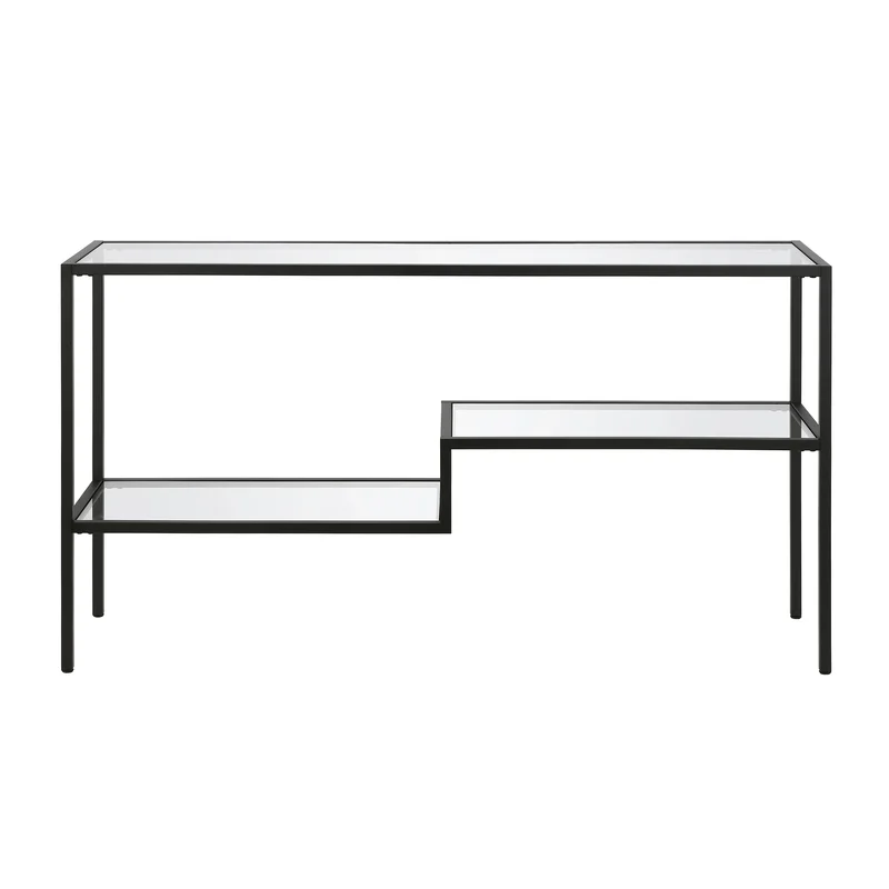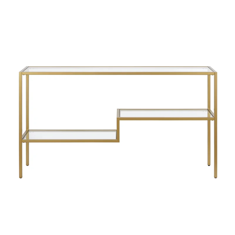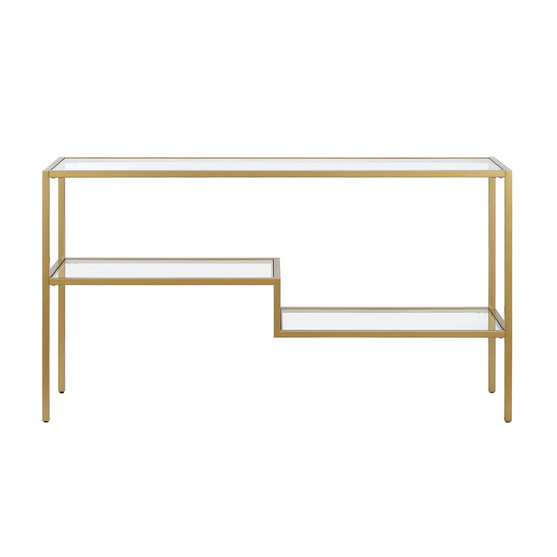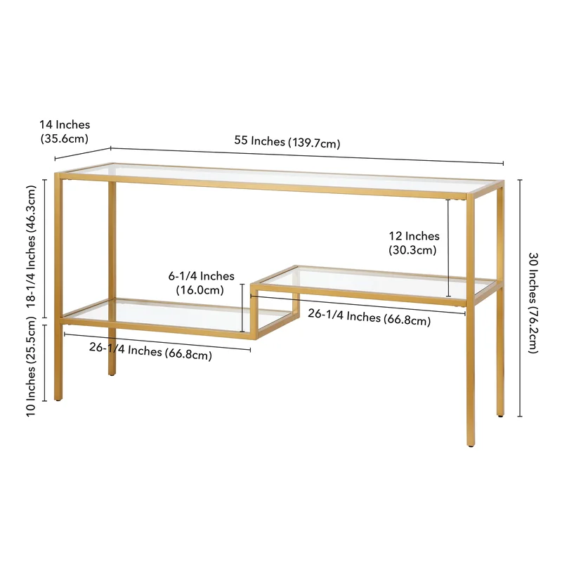 Bring a streamlined design to your living room or entryway with this modern console table. Crafted of steel in a metallic finish, this console table features a tempered glass tabletop that provides a perfect platform for framed photos or a pair of stylish lamps. A two-tiered glass shelf adds visual interest and creates extra storage space wherever you need it most.
