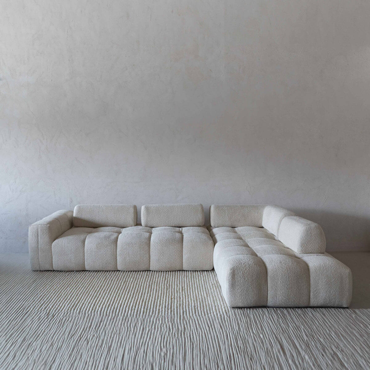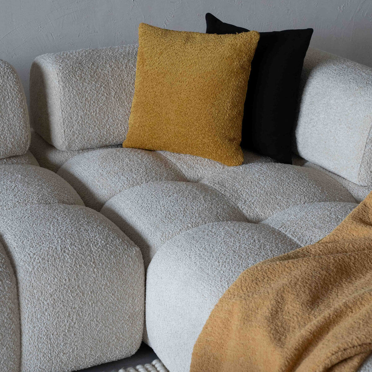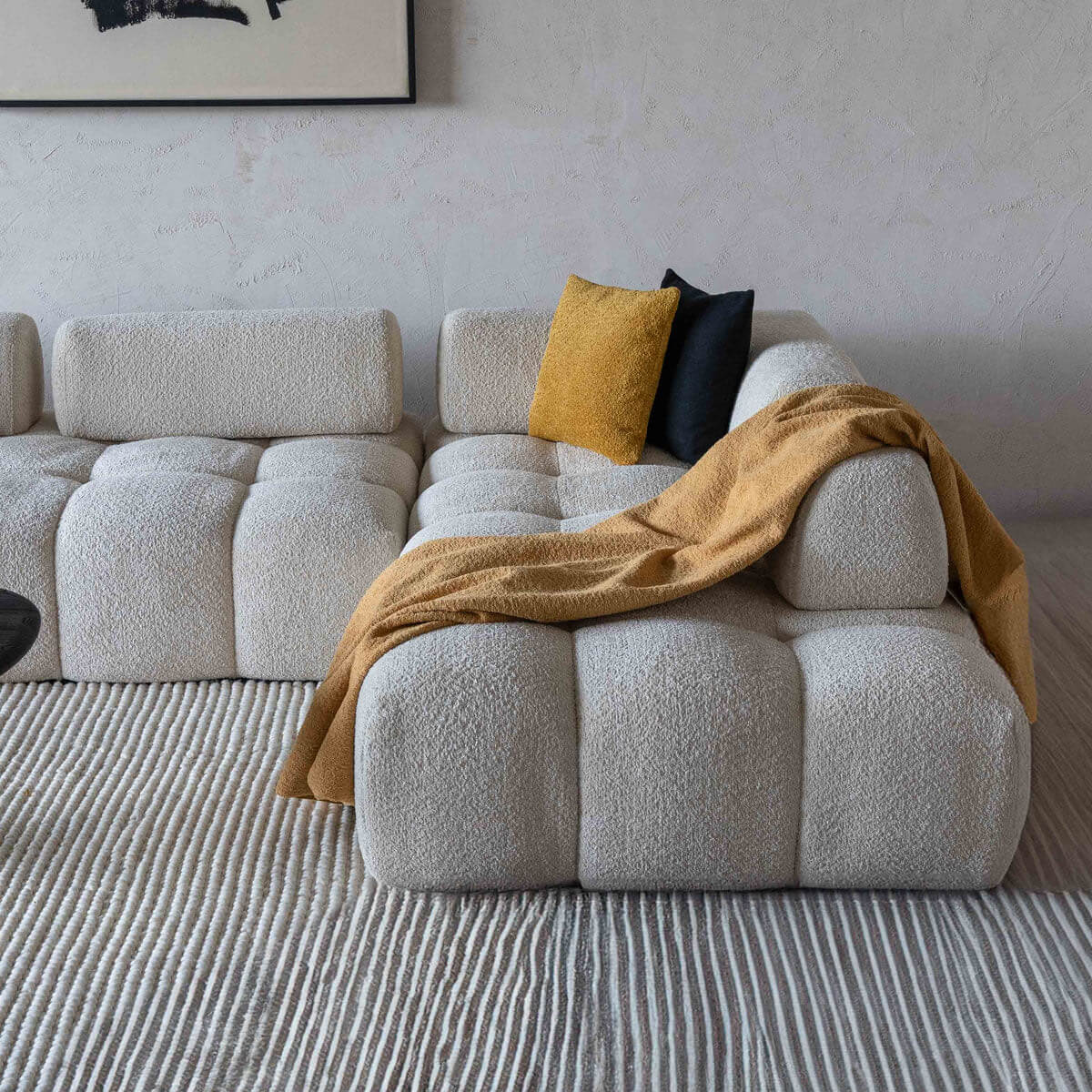 The Louisa Modular Bouclé Couch combines luxury and comfort with its soft textured fabric and customizable modular design. Perfect for modern living spaces, offering elegance, flexibility, and cozy relaxation.