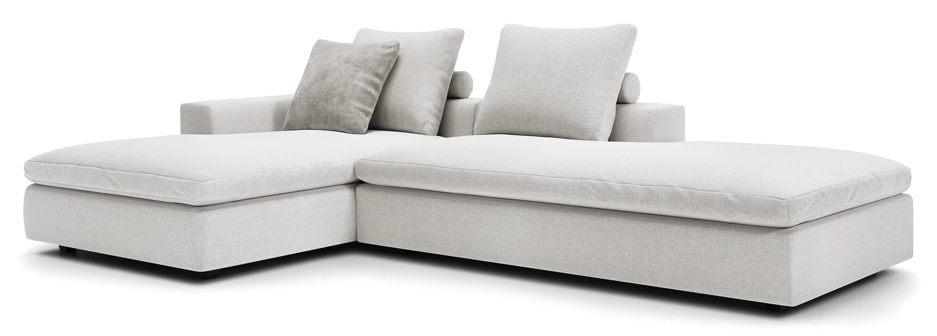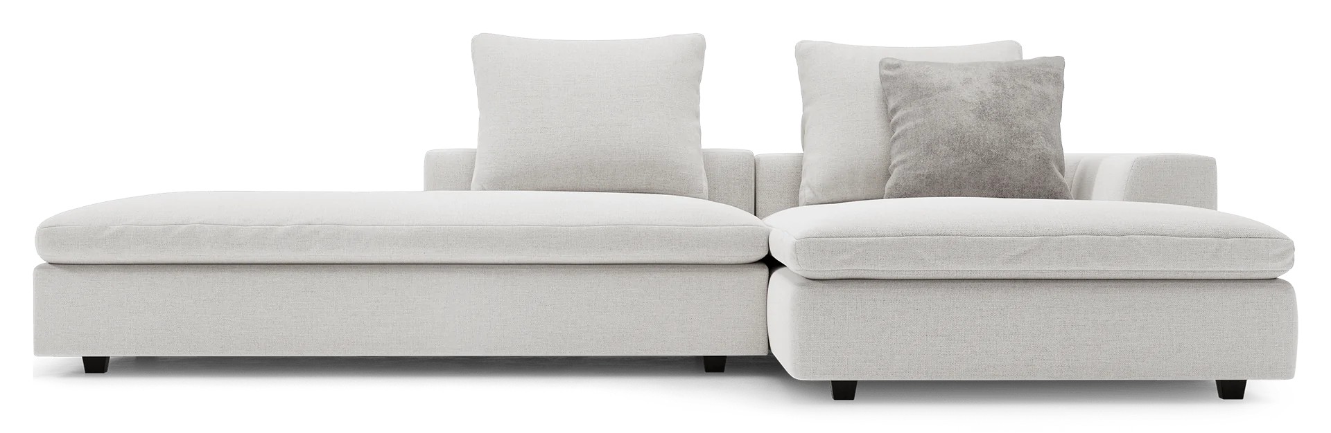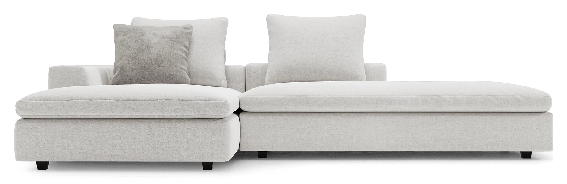 Perfect proportions and a relaxed fit can take Lucerne from casual to formal in any living space. Superb comfort is highlighted with a single, deep, bench seat filled in feather and down. Backrest pillows and oversized throw pillows (in accentuating fabric) provides both structure and casual relaxation. Round, decorative, bolsters keep the back pillows from sliding. Finished in rich, textured fabrics in basketweave patterns. Sofa frame made of solid alder wood. Hidden, recessed legs lift the frame off the floor. Sofa configuration as shown includes one left-facing end unit and one right-facing chaise unit.