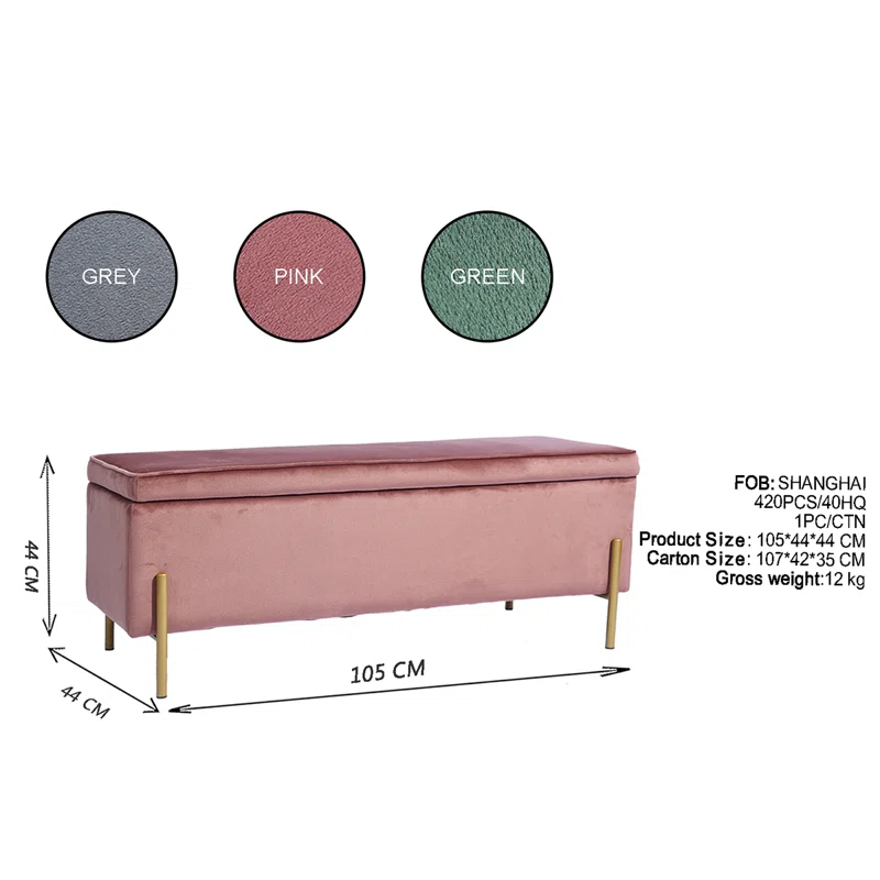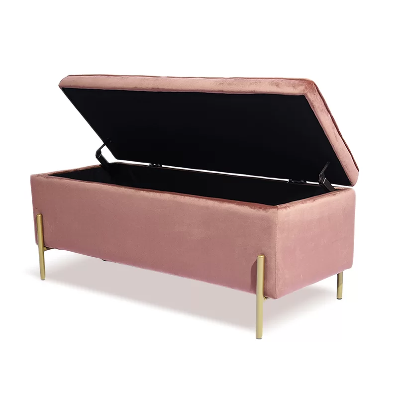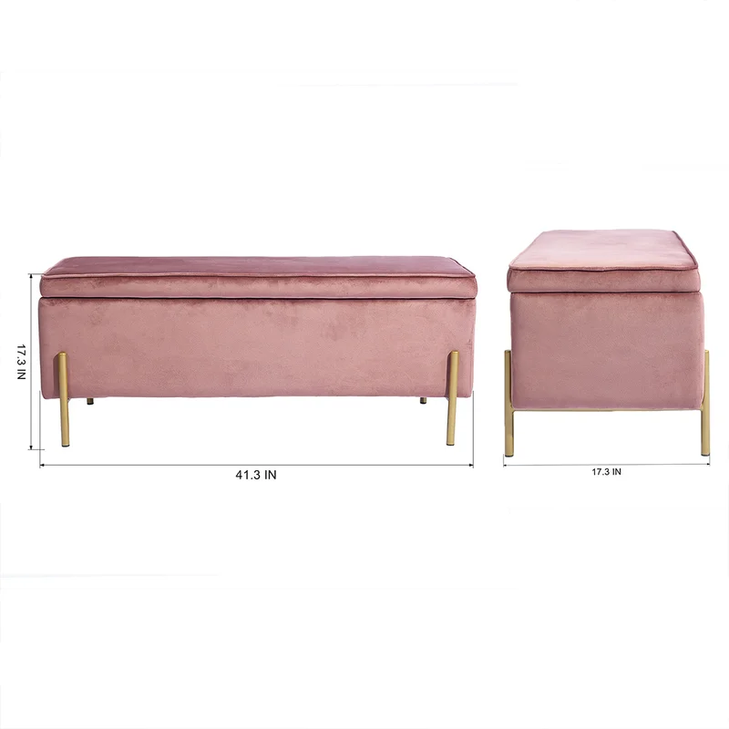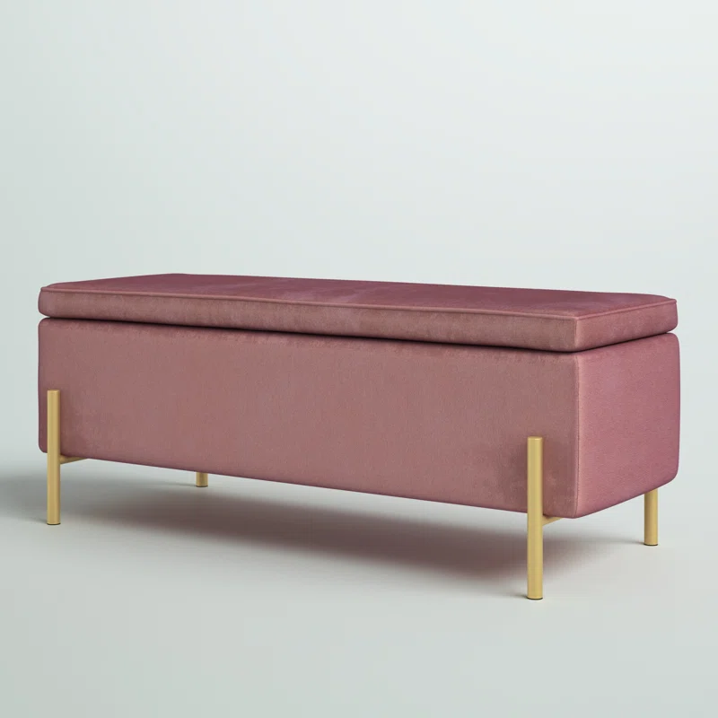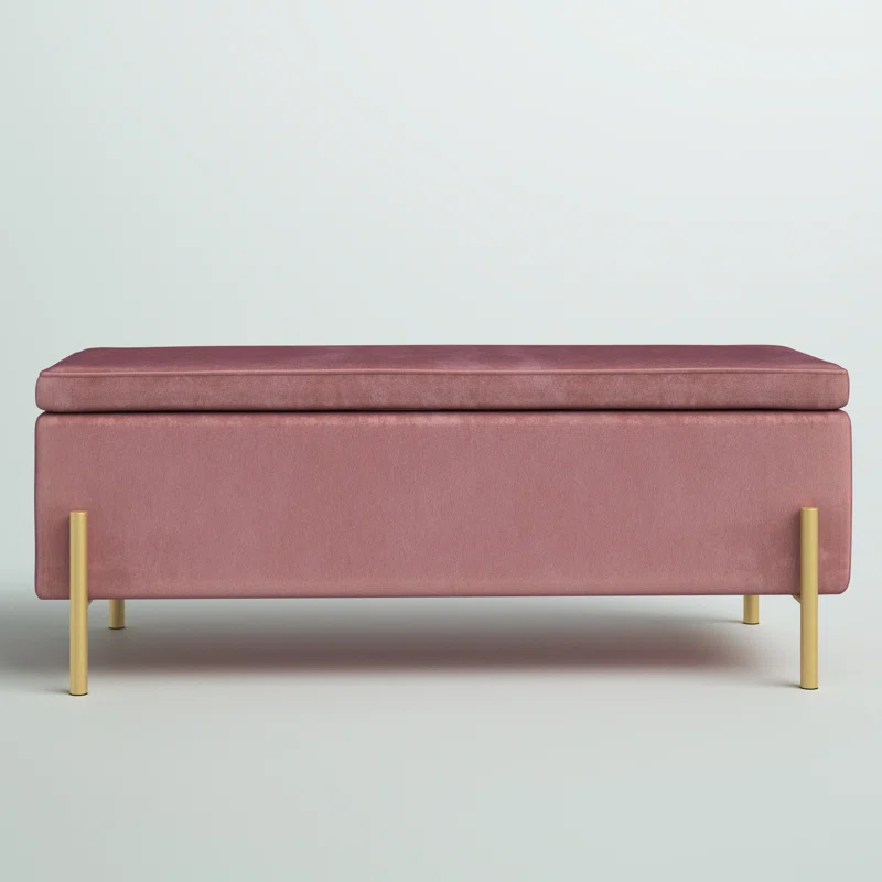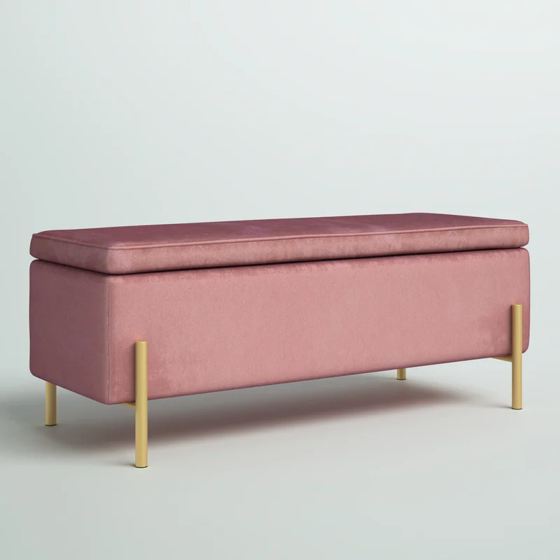 This storage bench brings much-needed storage and mid-century-inspired style to your bedroom or living room. It features a clean-lined silhouette that is wrapped in velvet and filled with foam for a hint of the cushion as you sit. You can lift the seat via hinges to reveal storage space where you can keep spare pillows, blankets, or even shoes. Four slim gold-finished metal legs support the bench to create a sleek design. It measures 41.3″ wide, making it ideal at the foot of your bed or in your foyer.