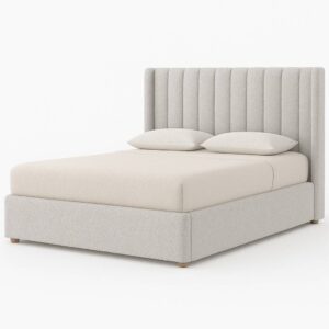 The vertical panel boucle bed from our Scarlet Collection brings modern symmetry and tactile softness to contemporary bedrooms. Upholstered in textured boucle fabric and defined by clean vertical channel stitching, this design adds a sculptural element to any sleep space. The set includes a minimalist base and high-back headboard, offering a clean canvas to style with your preferred linens.
