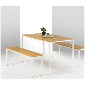 Serving up style and sunday brunch without taking up precious floor space, this dining table set is a perfect pick for apartments and breakfast nooks. Founded atop a steel frame and made from solid and manufactured wood, this table set showcases a wood grain finish, while two benches round out the modern look with their clean lines. As a bonus, the benches tuck away under the table when not in use.