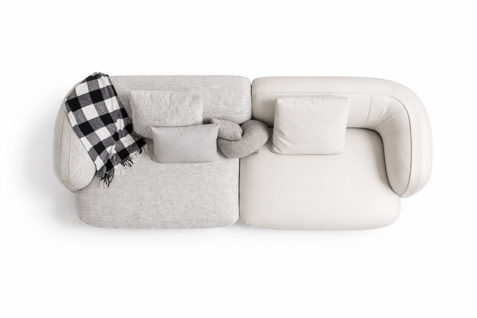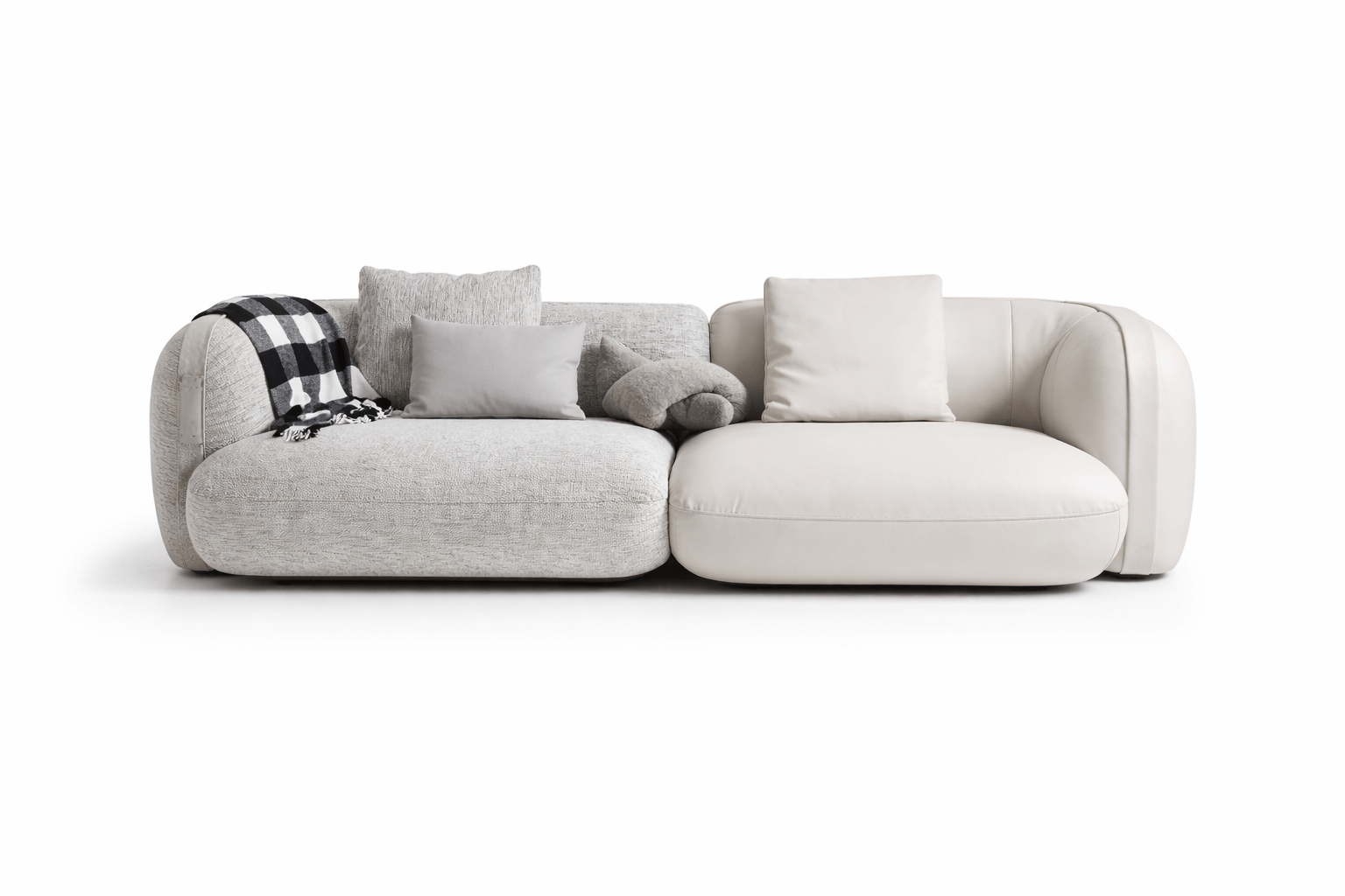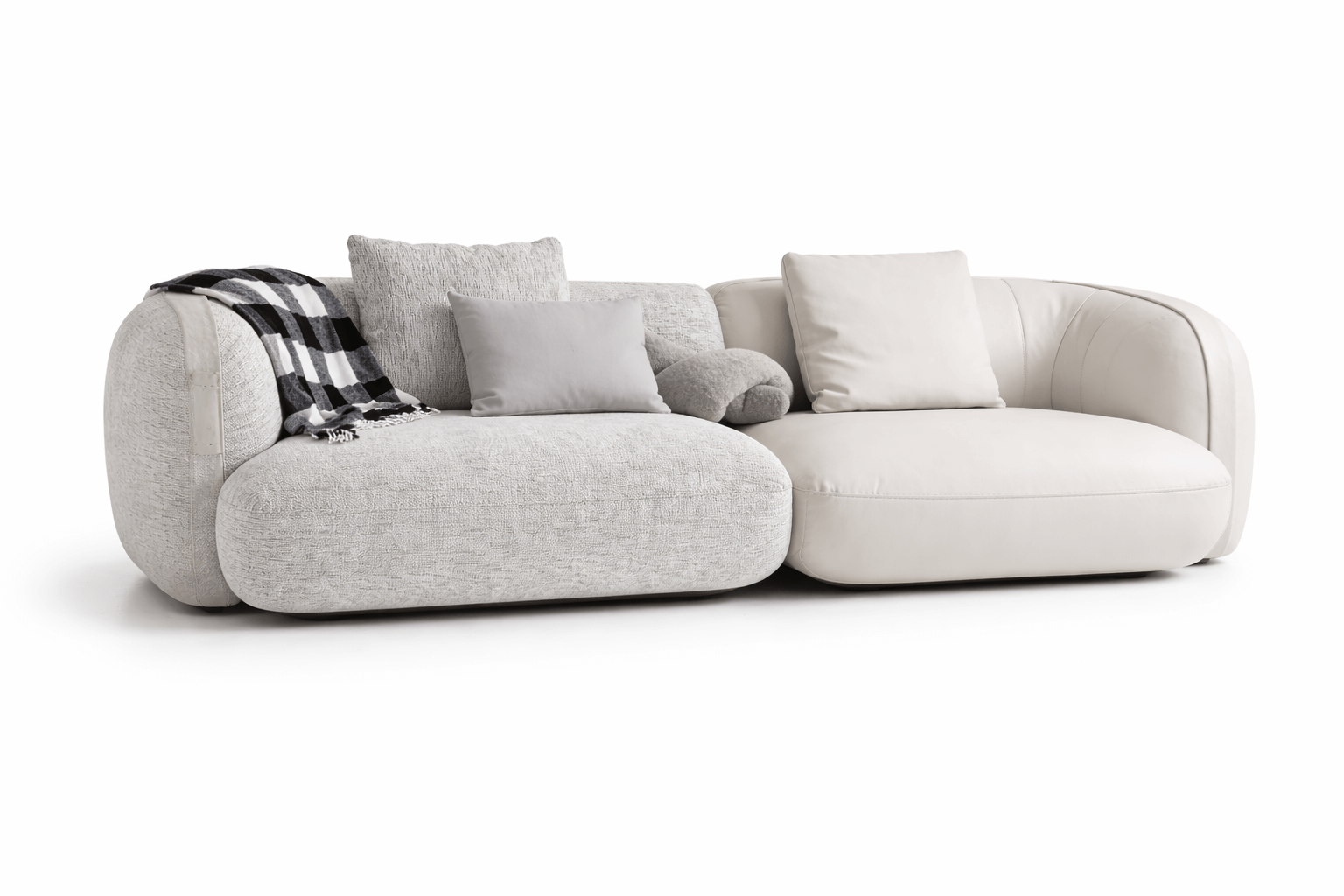 It is a modern statement piece designed for luxury living. Featuring a soft curved silhouette, deep lounge seating, and a premium two-tone finish, this sofa blends comfort with high-end minimalist style. The oversized chaise creates the perfect space for relaxing, entertaining, or stretching out in complete comfort.